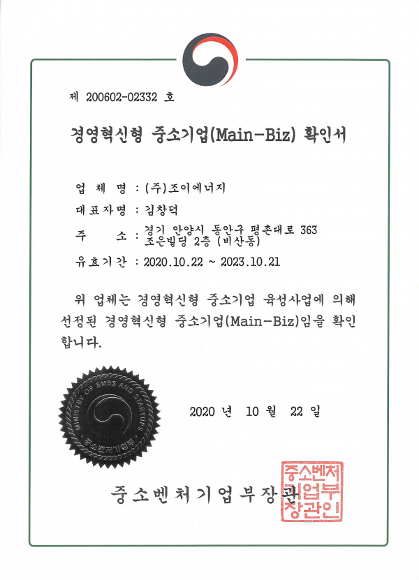 (주)조이에너지가 중소벤처기업부에 의해 2020년