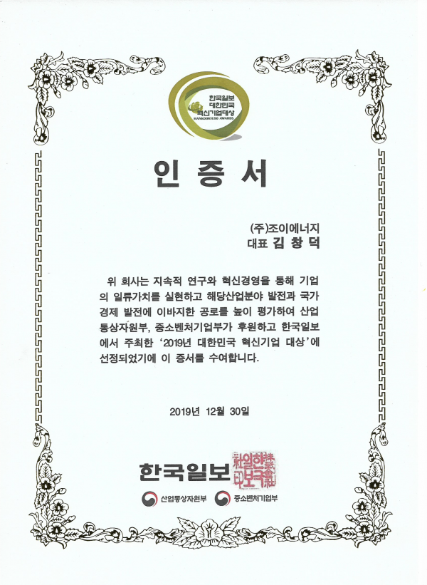 2019년 대한민국 혁신기업 대상에 선정된 한국일보 증서입니다.